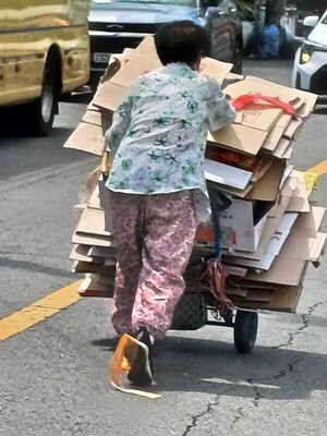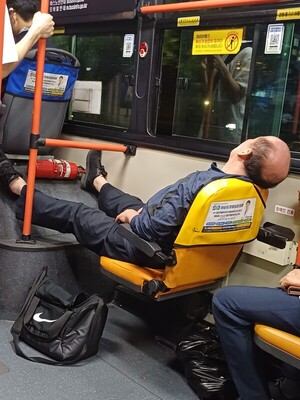 우리들의 이웃 家長8월 23일 오후 9시경 대구에서 경산으로 가는 시내버스 안에 하루 일을 마치고 퇴근하는 한 노동자가 꿀맛 같은 잠(휴식)을 자고 있다. 김영곤 기자