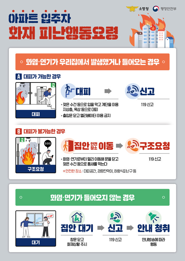 반대로 다른 세대나 복도, 계단실 등에서 화재가 발생했을 경우에는 화염과 연기가 실내로 유입되지 않는다면 창문을 닫고 집 안에서 대기하며 119에 신고해야 한다. 이때 안내 방송과 소방당국의 지시에 따라 침착하게 행동하는 것이 안전하다.