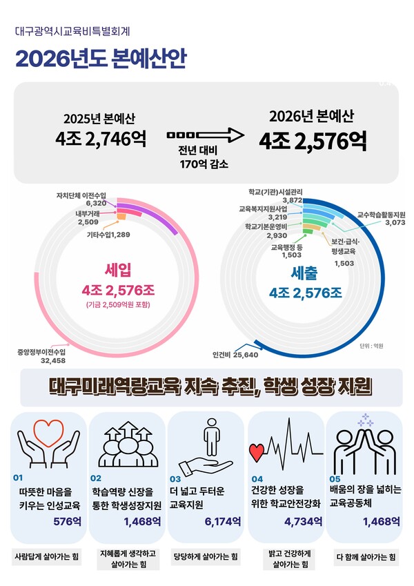 대구시교육청은 2026년도 대구광역시교육비특별회계 예산안을 올해 예산보다 170억 원 감액된 4조 2,576억 원으로 편성해 10월 27일(월) 대구시의회에 제출했다고 밝혔다.
